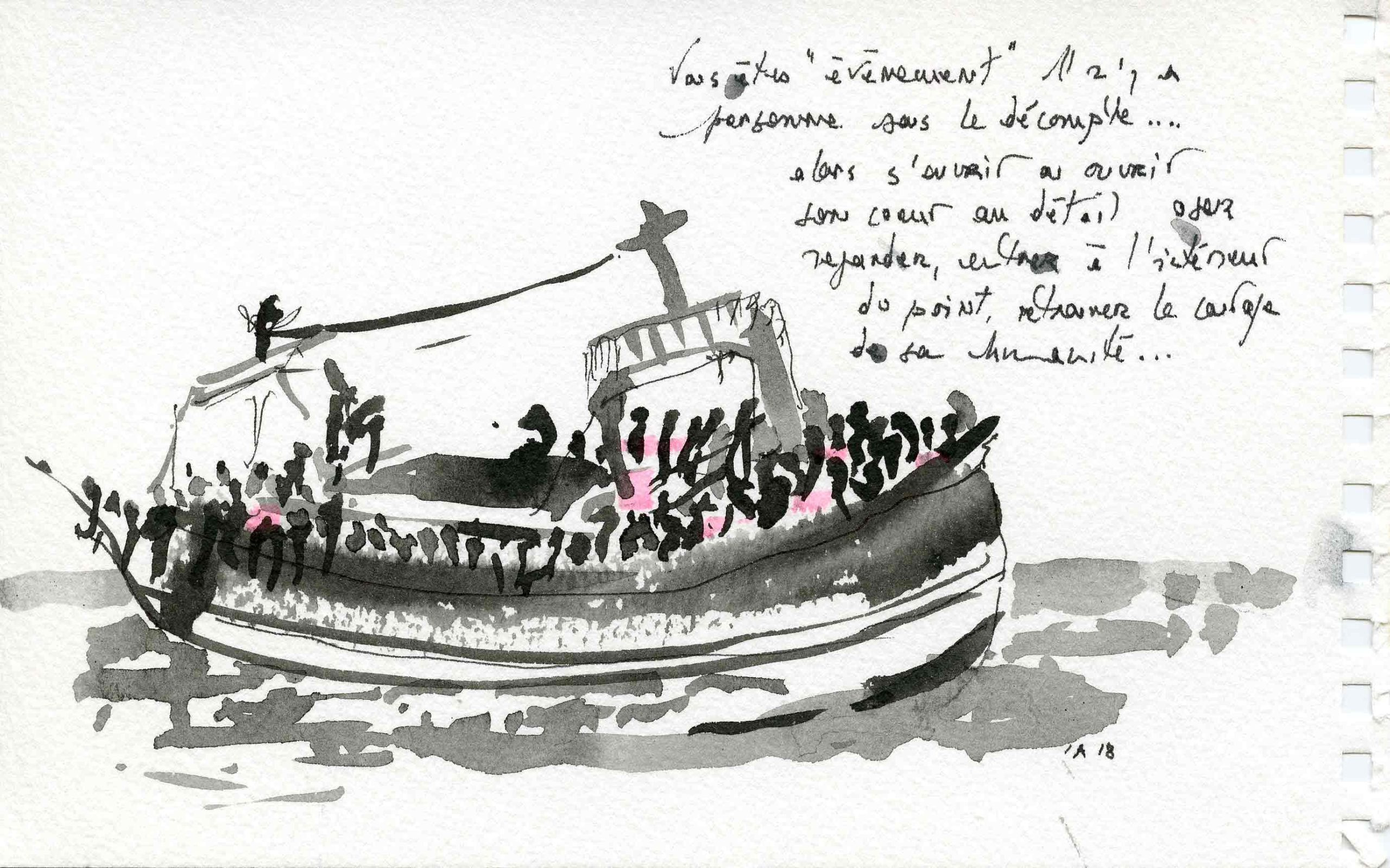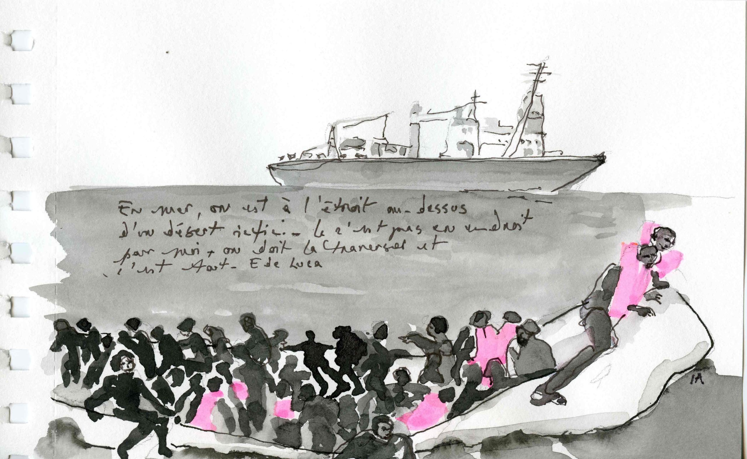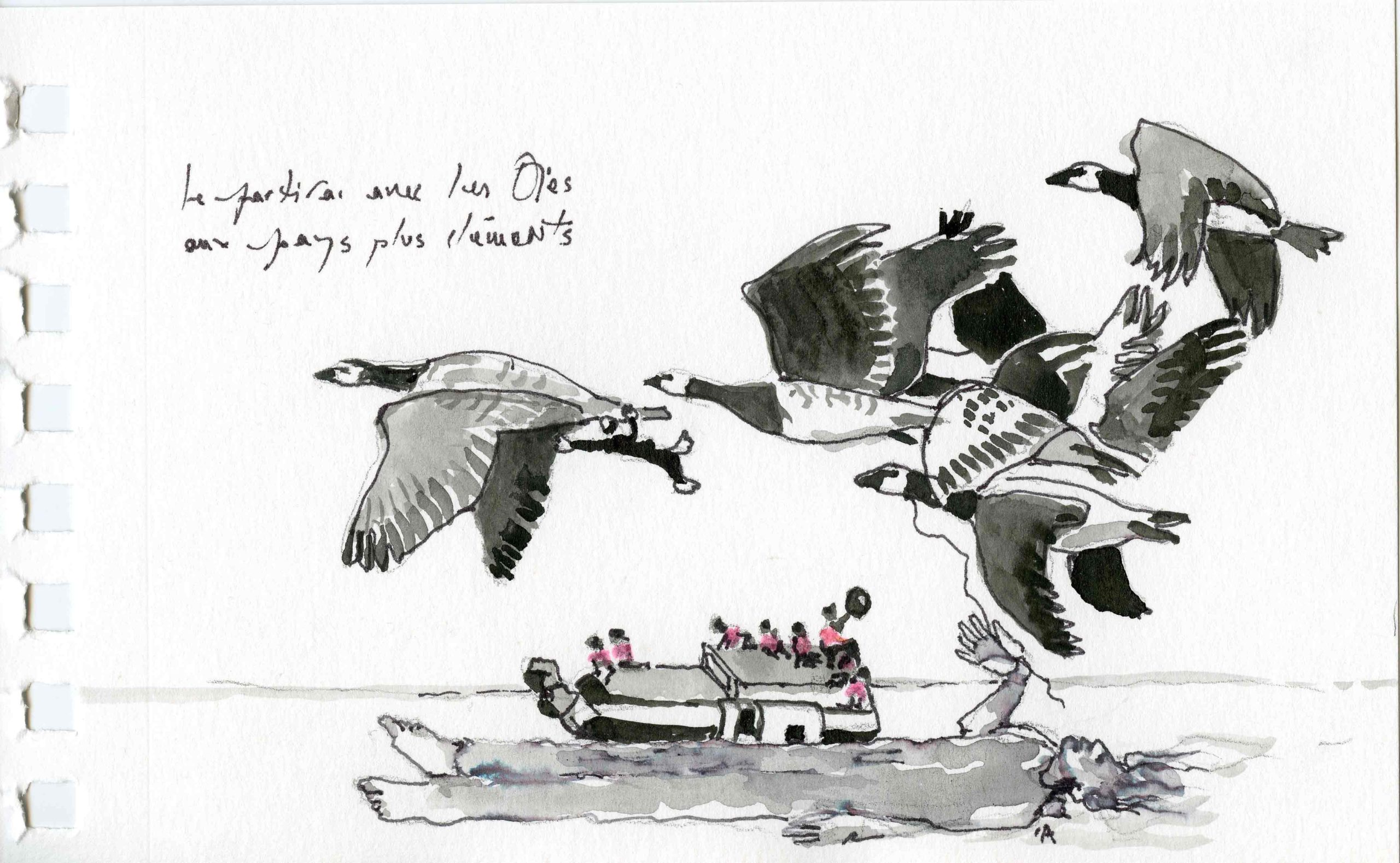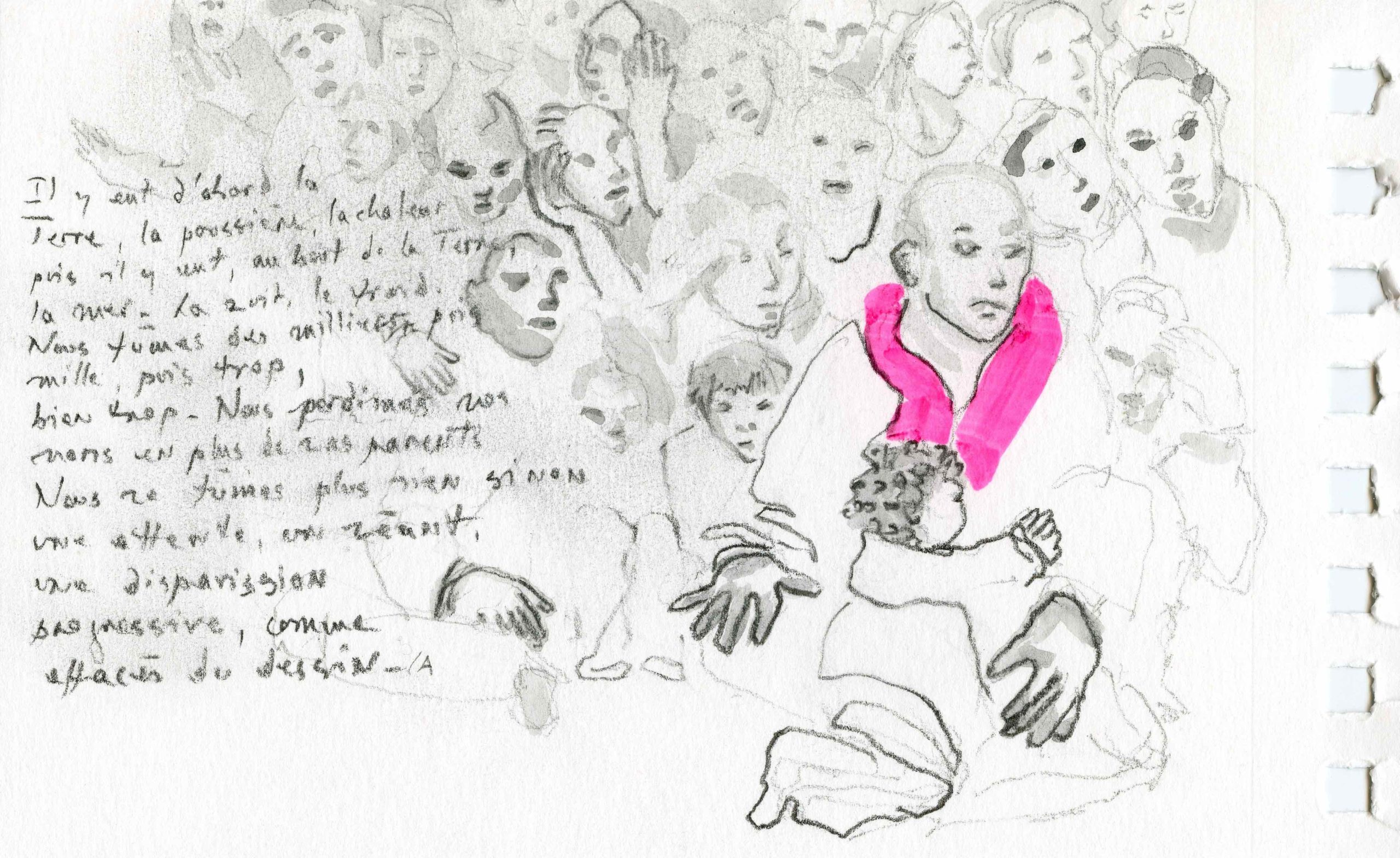 Et ce sujet des migrants, des déplacés, des déportés, des gens jetés sur les routes, des pieds enflés, brûlants, des estomacs vides, de l’espoir auquel on s’accroche pour ne pas sombrer dans le néant du désespoir, de la chute sans fin dans l’incompréhension la plus grande, de ce cri muet, indicible quand tout sens disparaît …des fois la douleur, la colère, la haine qui nous tord et nous perd de tant de violence autour et dedans…tout cela je peux par mes dessins le vivre, le revivre, tout cela devient/est vrai.