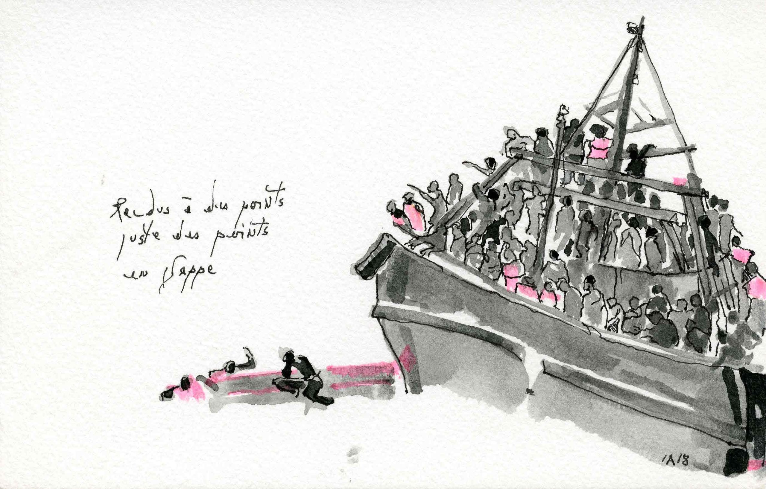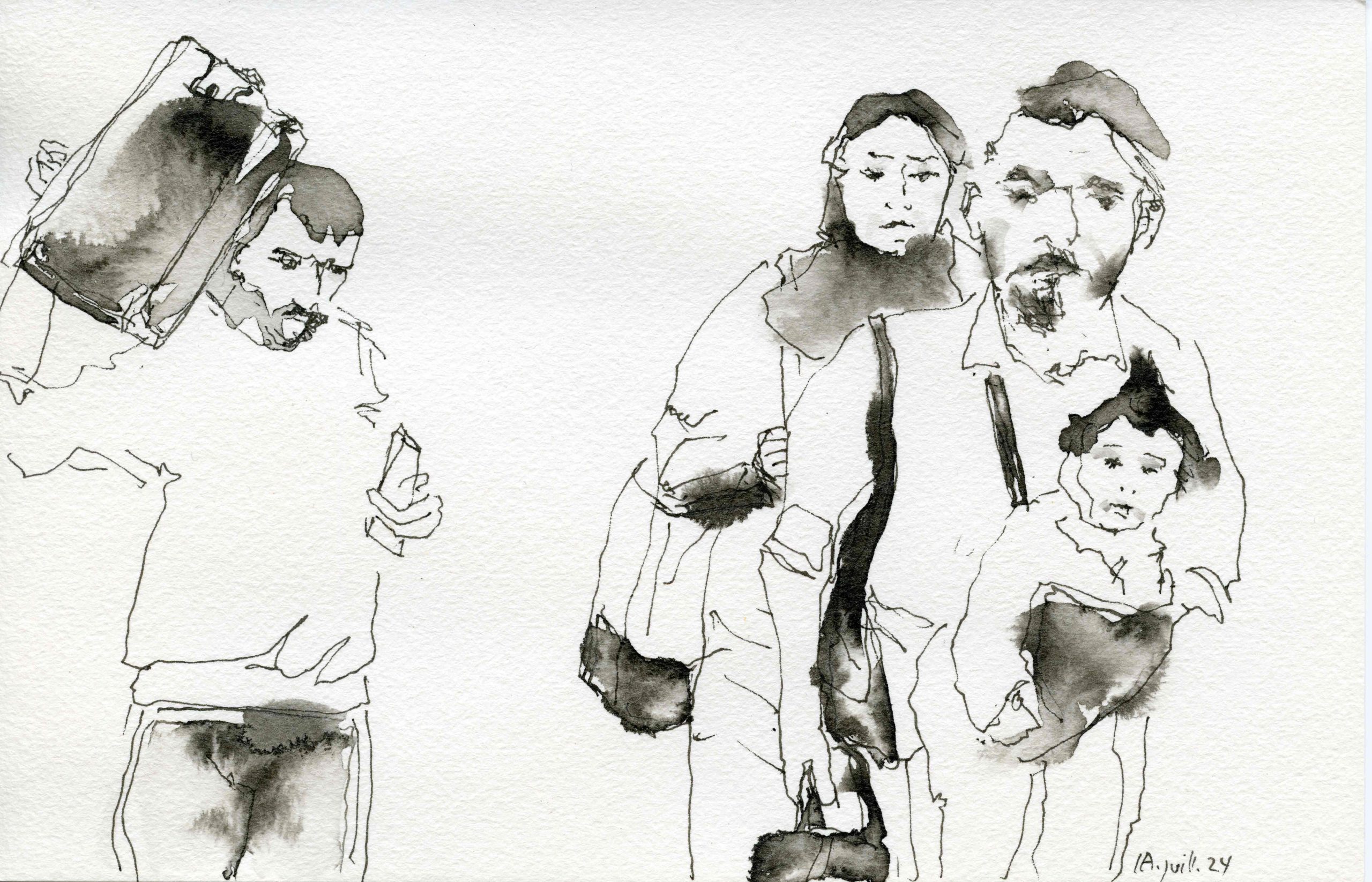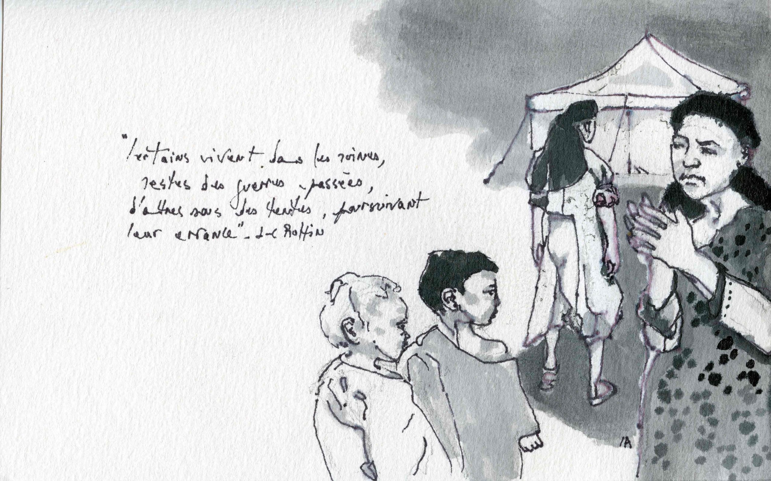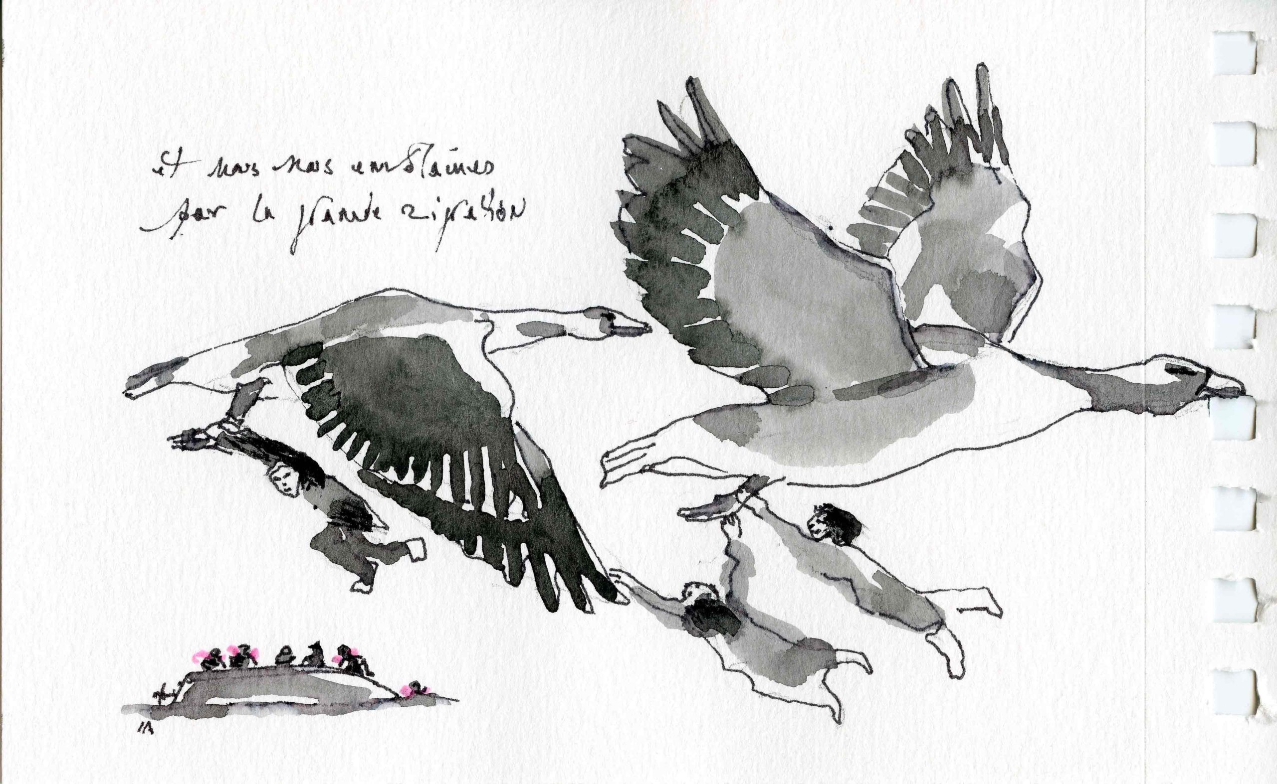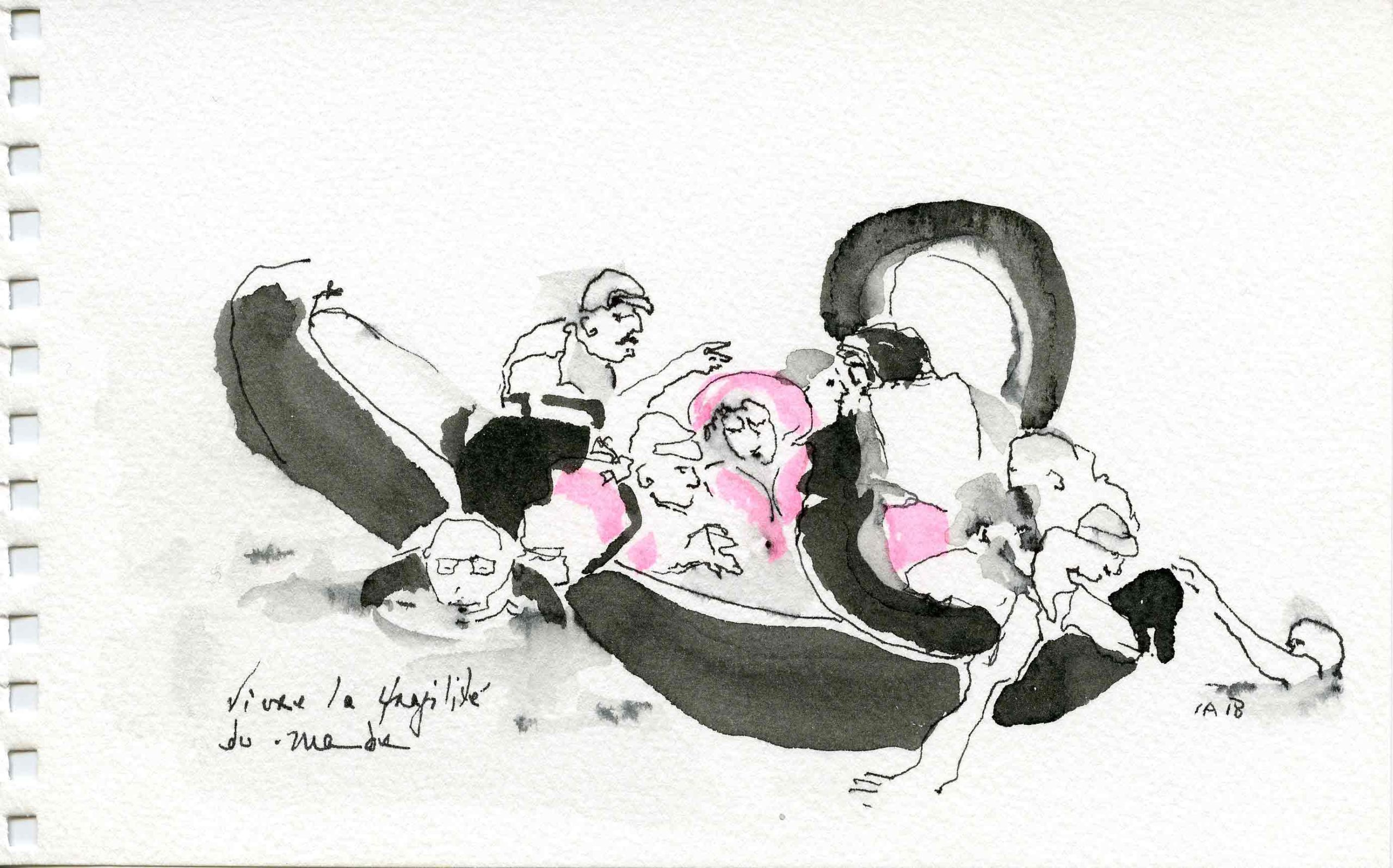 Et ce sujet des migrants, des déplacés, des déportés, des gens jetés sur les routes, des pieds enflés, brûlants, des estomacs vides, de l’espoir auquel on s’accroche pour ne pas sombrer dans le néant du désespoir, de la chute sans fin dans l’incompréhension la plus grande, de ce cri muet, indicible quand tout sens disparaît …des fois la douleur, la colère, la haine qui nous tord et nous perd de tant de violence autour et dedans…tout cela je peux par mes dessins le vivre, le revivre, tout cela devient/est vrai.