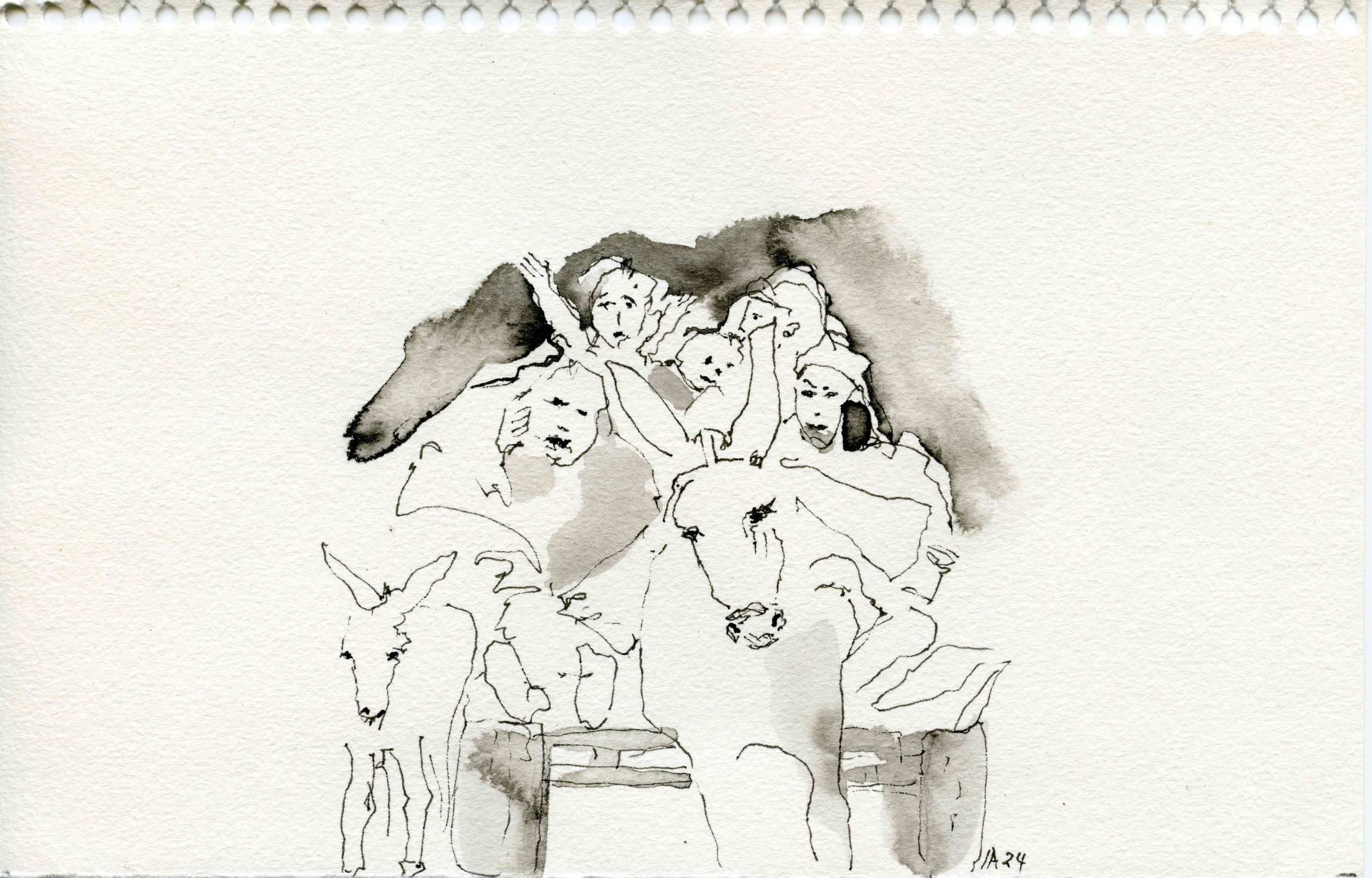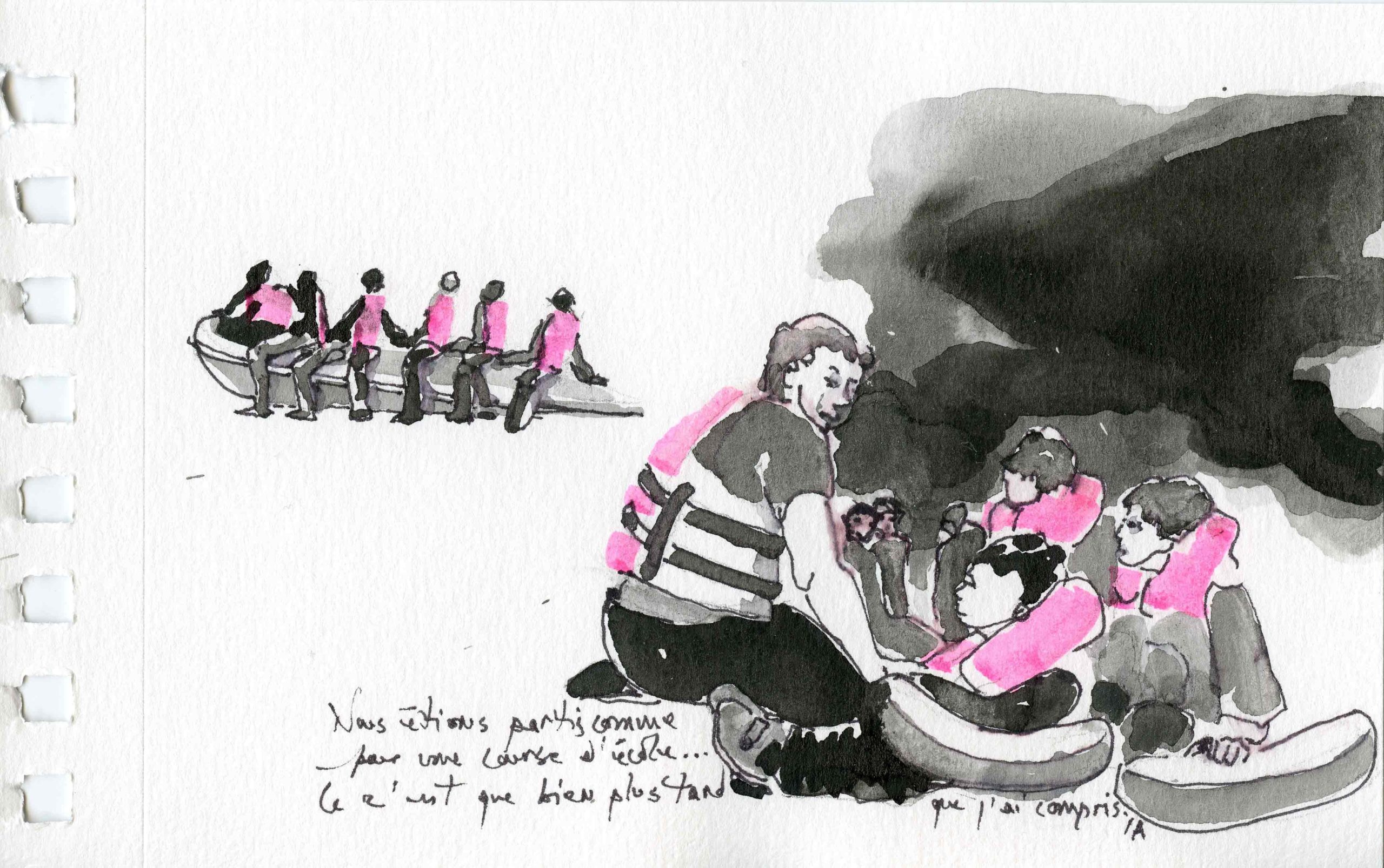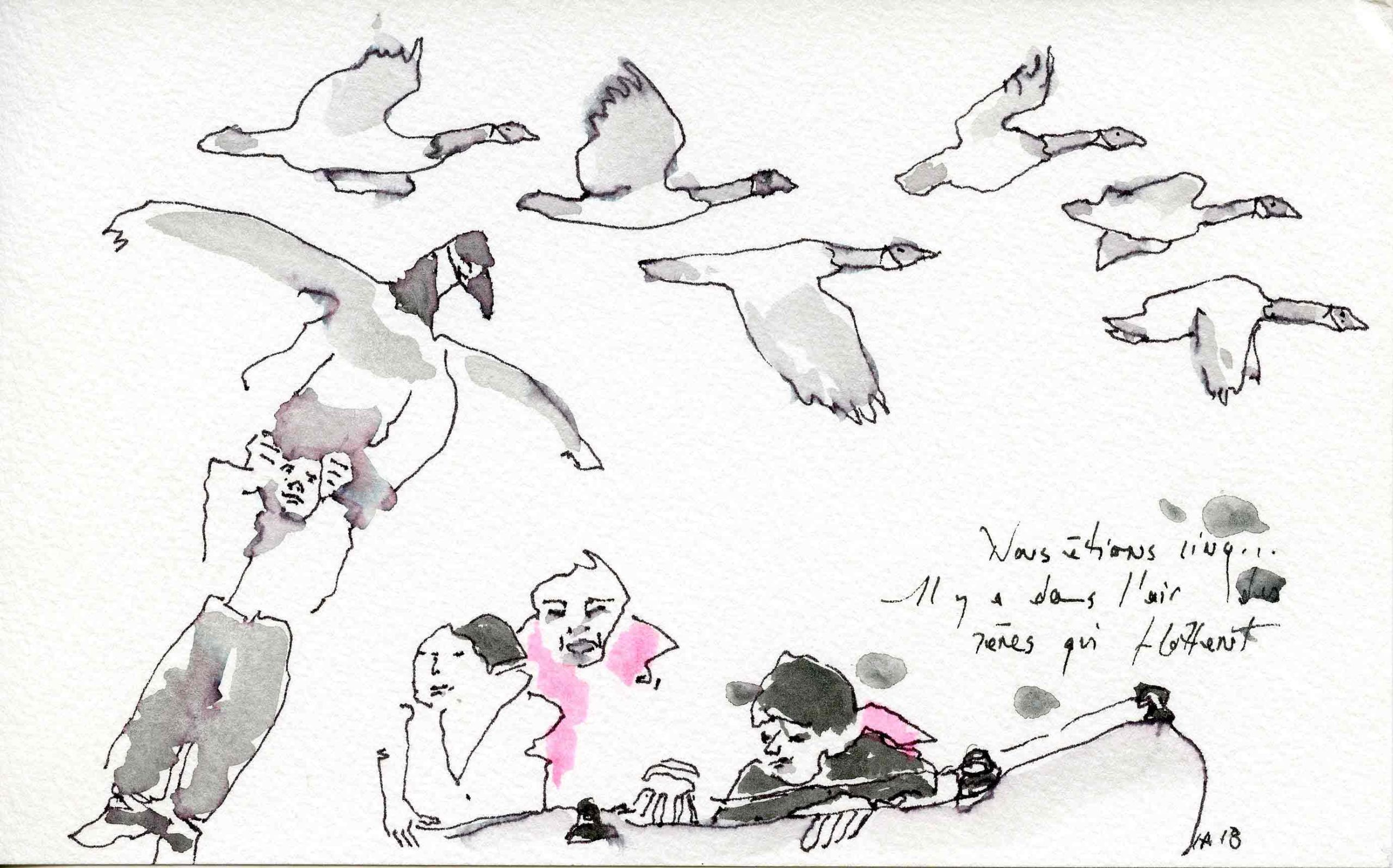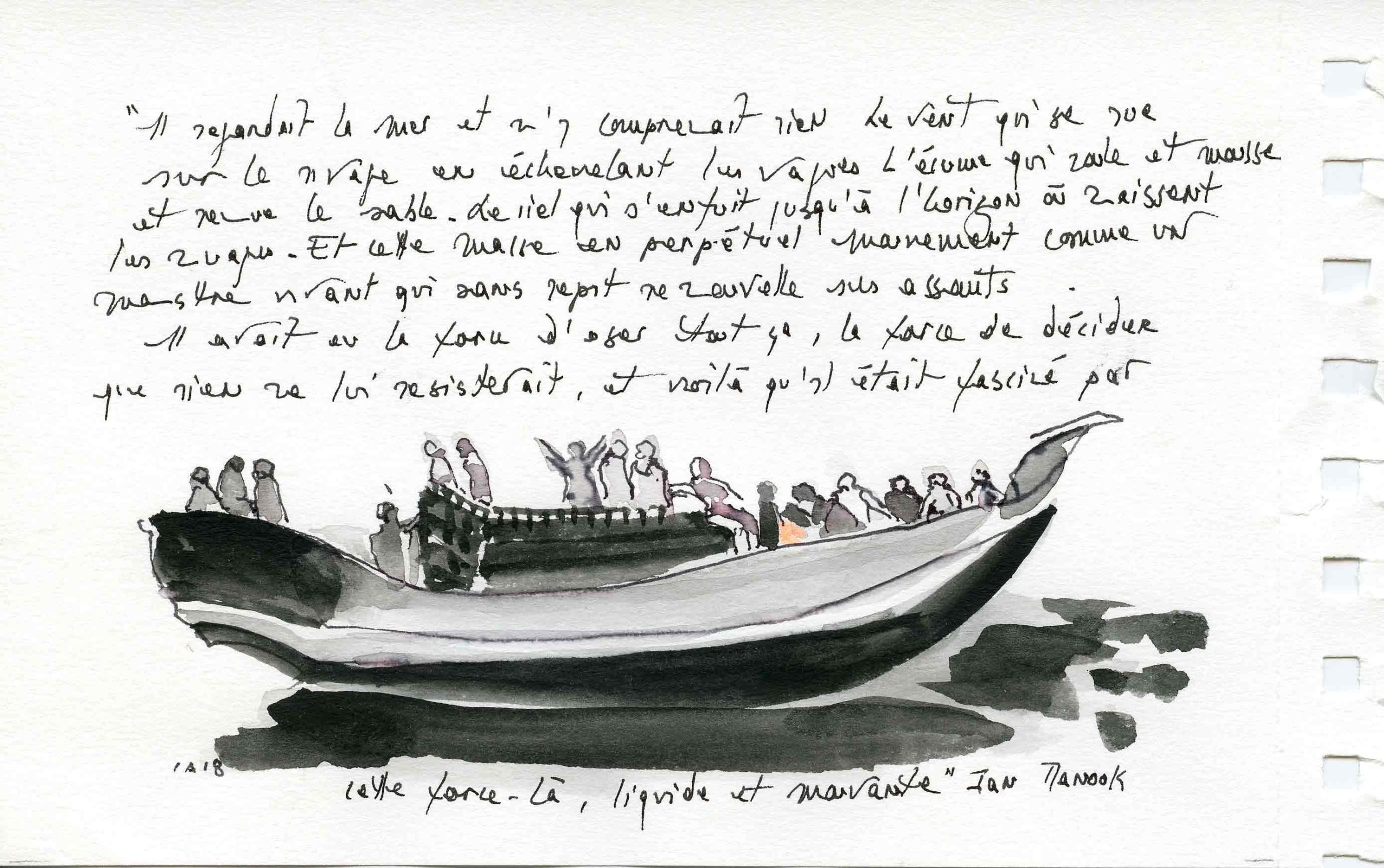 Et ce sujet des migrants, des déplacés, des déportés, des gens jetés sur les routes, des pieds enflés, brûlants, des estomacs vides, de l’espoir auquel on s’accroche pour ne pas sombrer dans le néant du désespoir, de la chute sans fin dans l’incompréhension la plus grande, de ce cri muet, indicible quand tout sens disparaît …des fois la douleur, la colère, la haine qui nous tord et nous perd de tant de violence autour et dedans…tout cela je peux par mes dessins le vivre, le revivre, tout cela devient/est vrai.