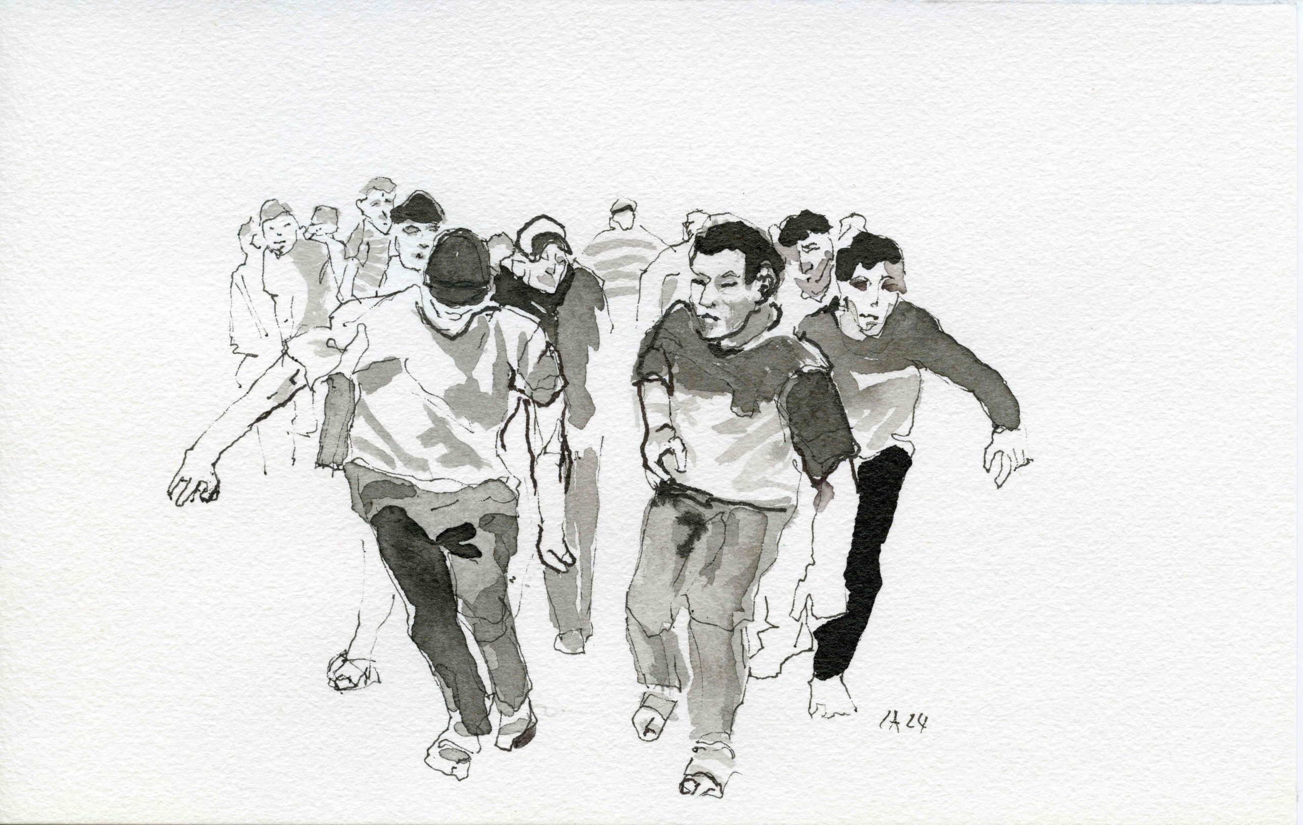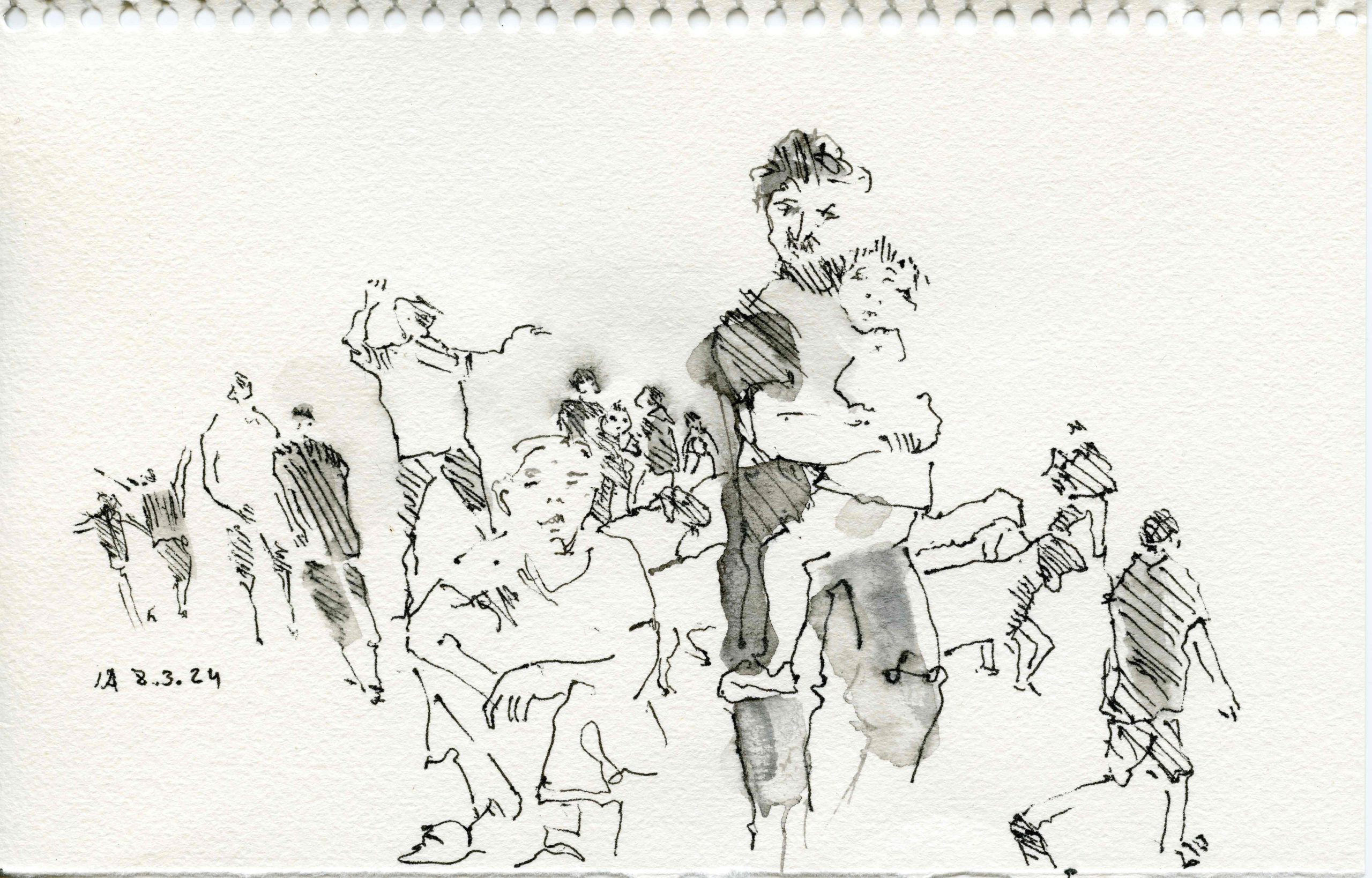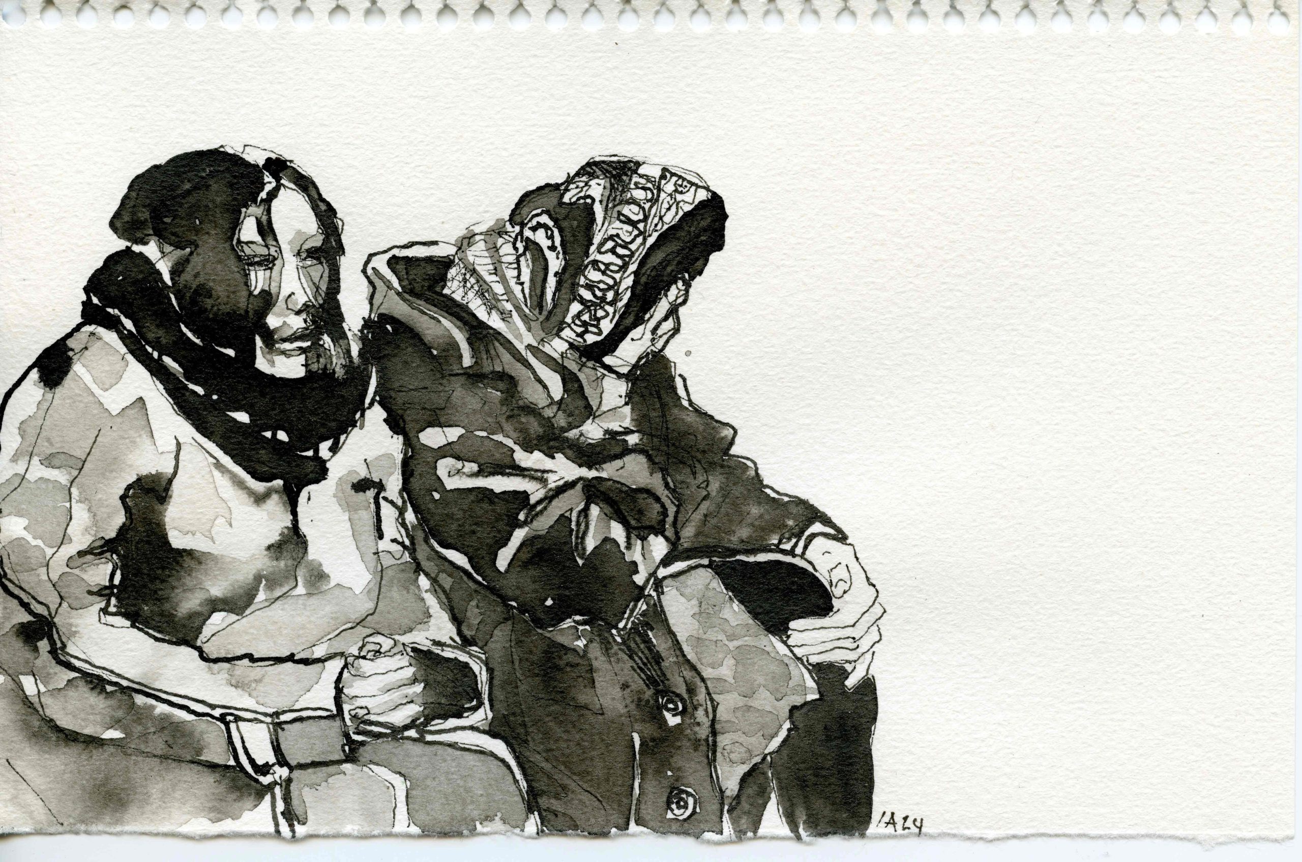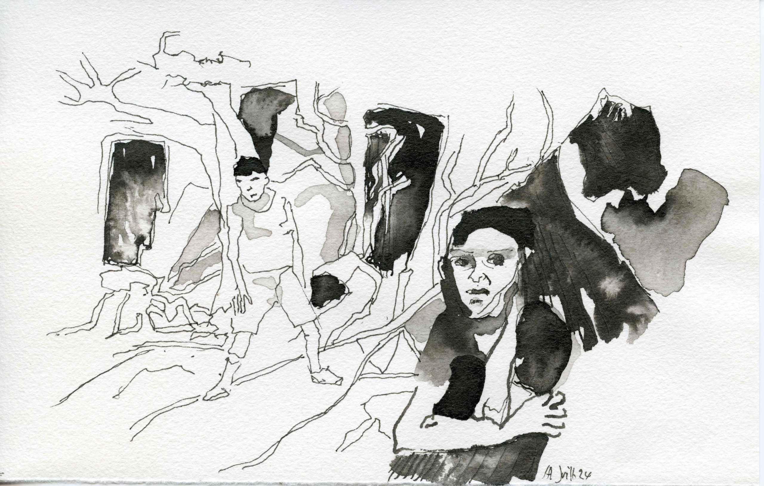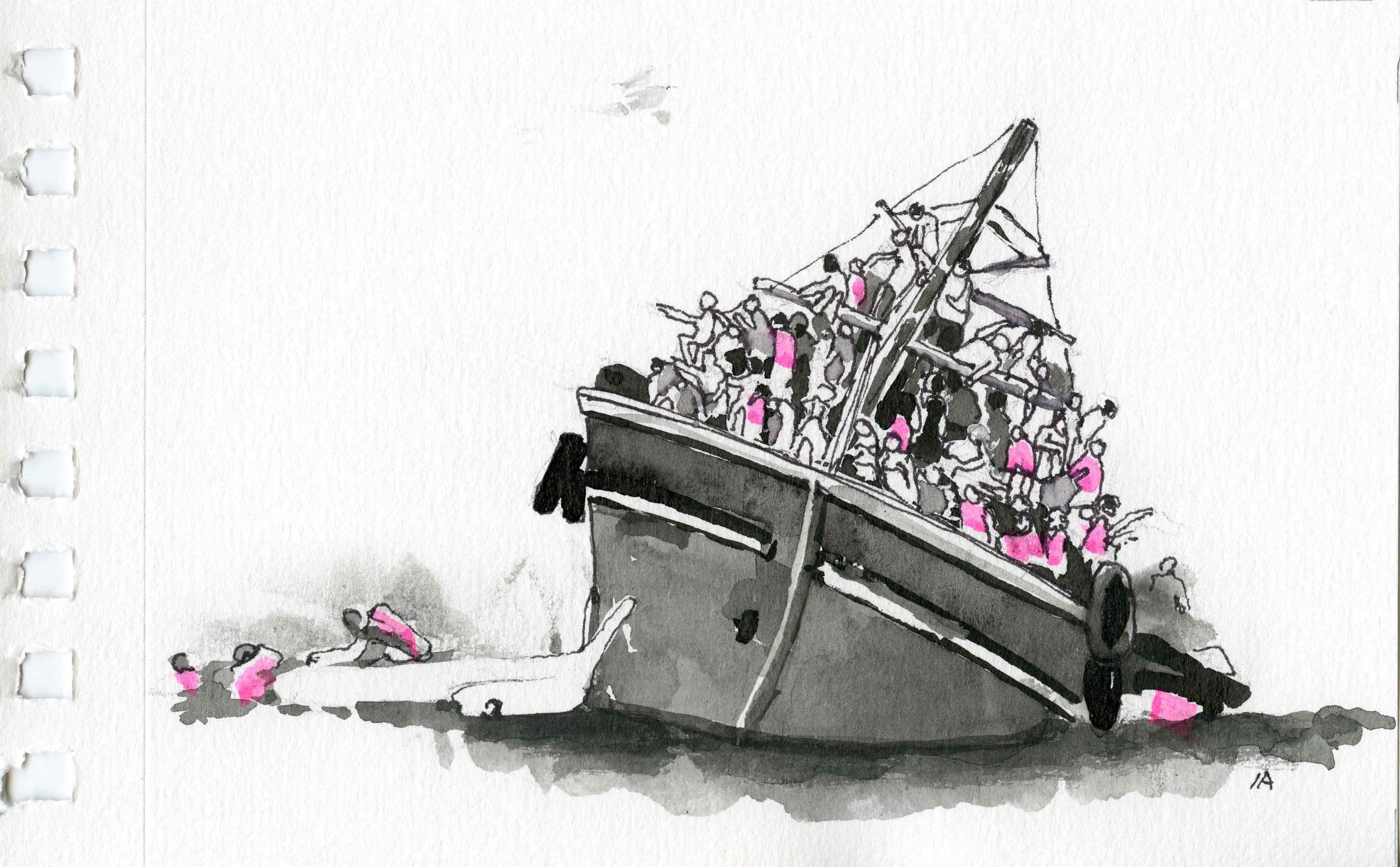 Et ce sujet des migrants, des déplacés, des déportés, des gens jetés sur les routes, des pieds enflés, brûlants, des estomacs vides, de l’espoir auquel on s’accroche pour ne pas sombrer dans le néant du désespoir, de la chute sans fin dans l’incompréhension la plus grande, de ce cri muet, indicible quand tout sens disparaît …des fois la douleur, la colère, la haine qui nous tord et nous perd de tant de violence autour et dedans…tout cela je peux par mes dessins le vivre, le revivre, tout cela devient/est vrai.