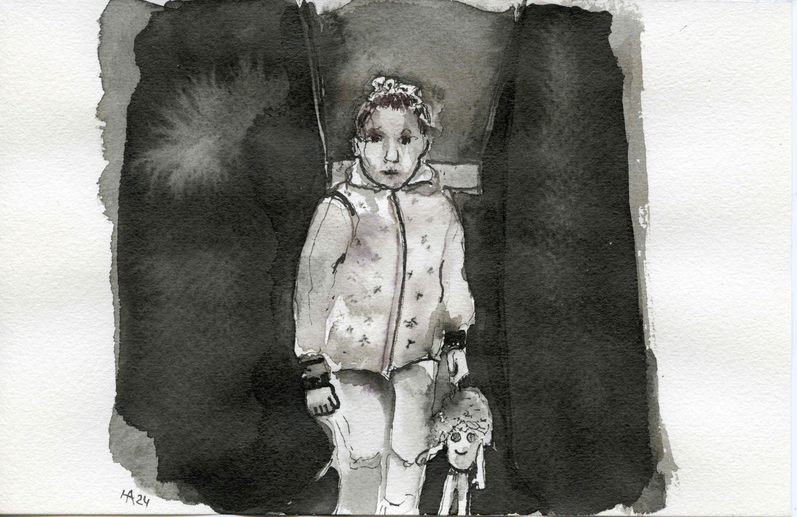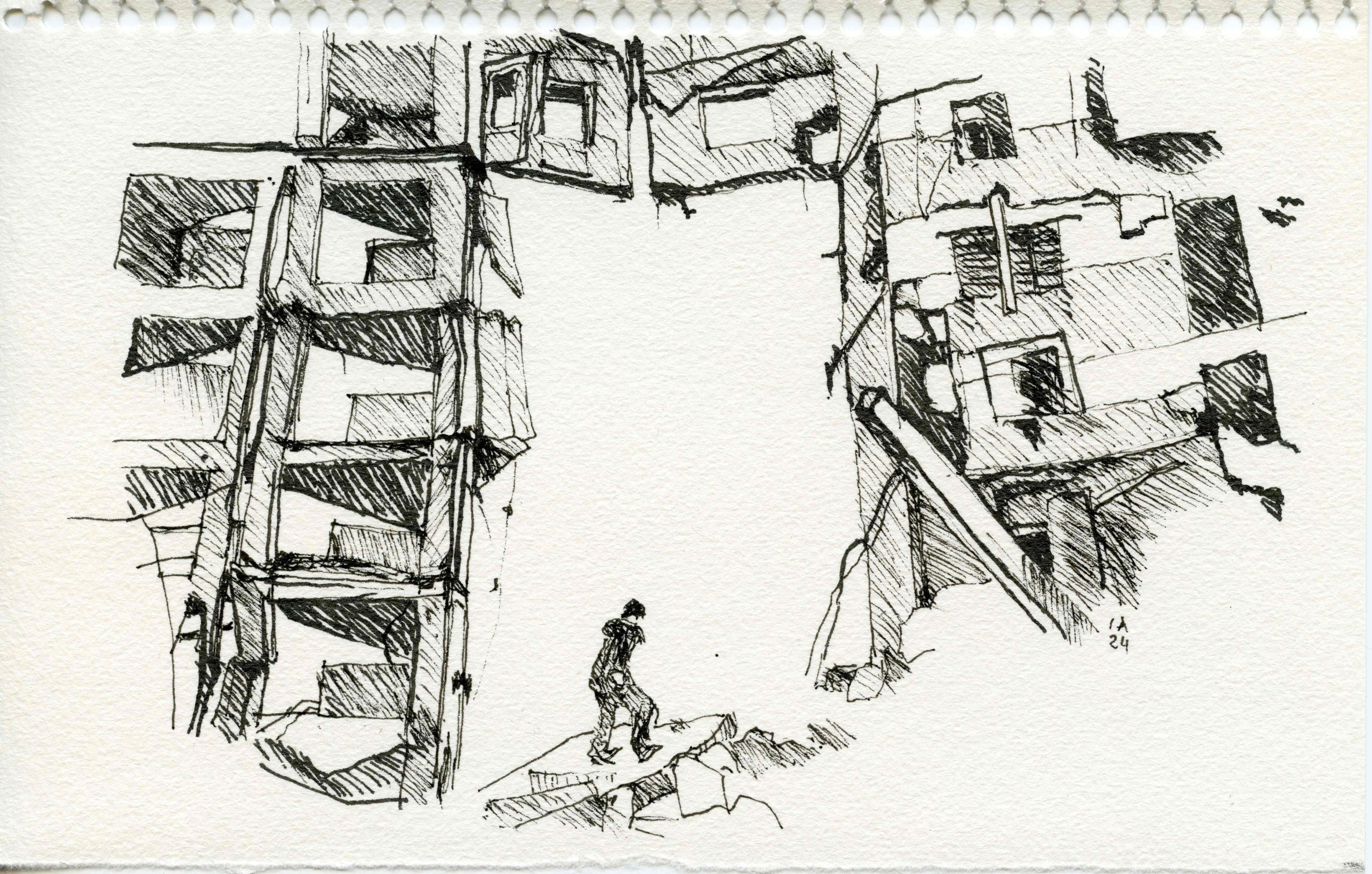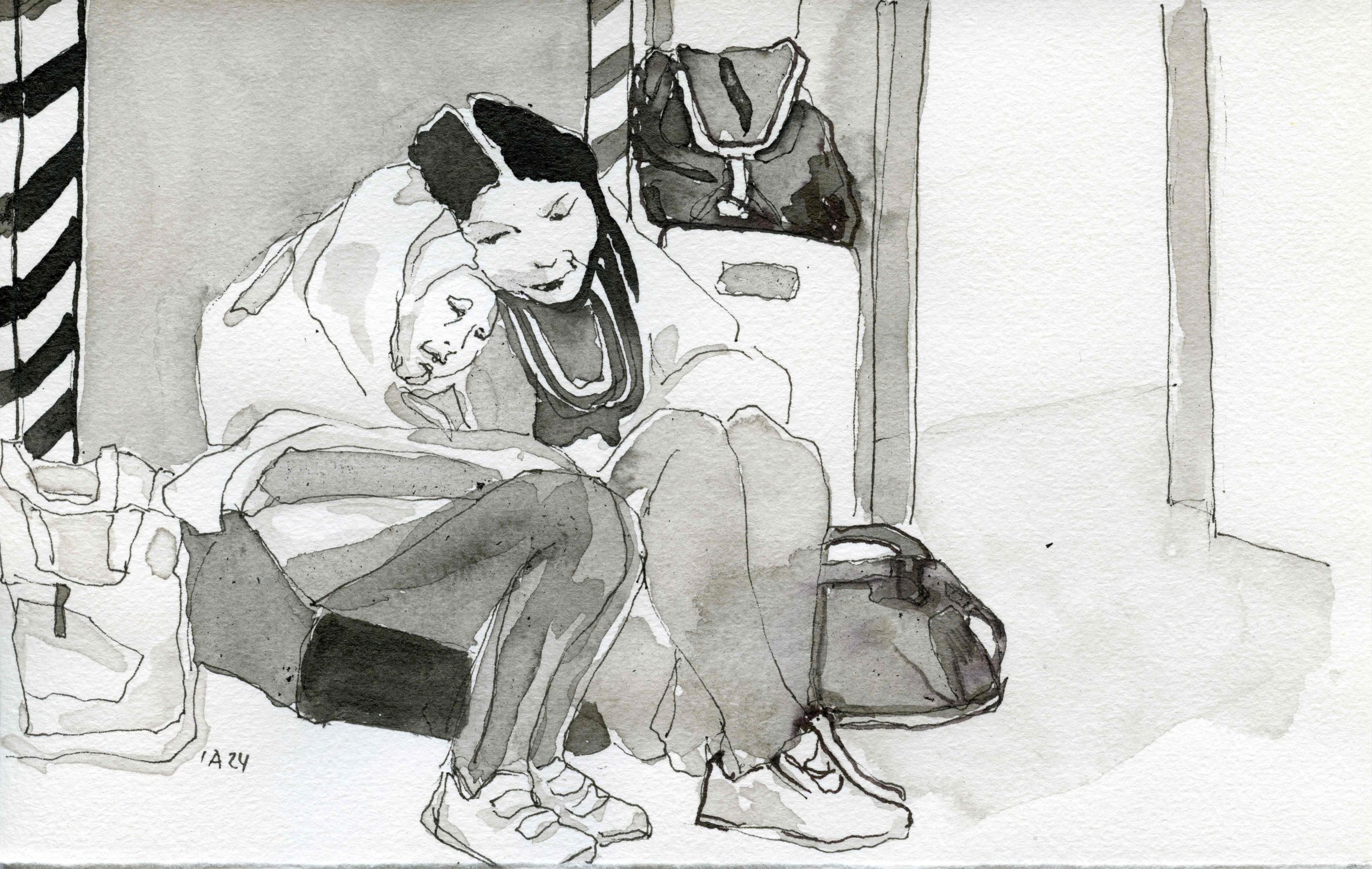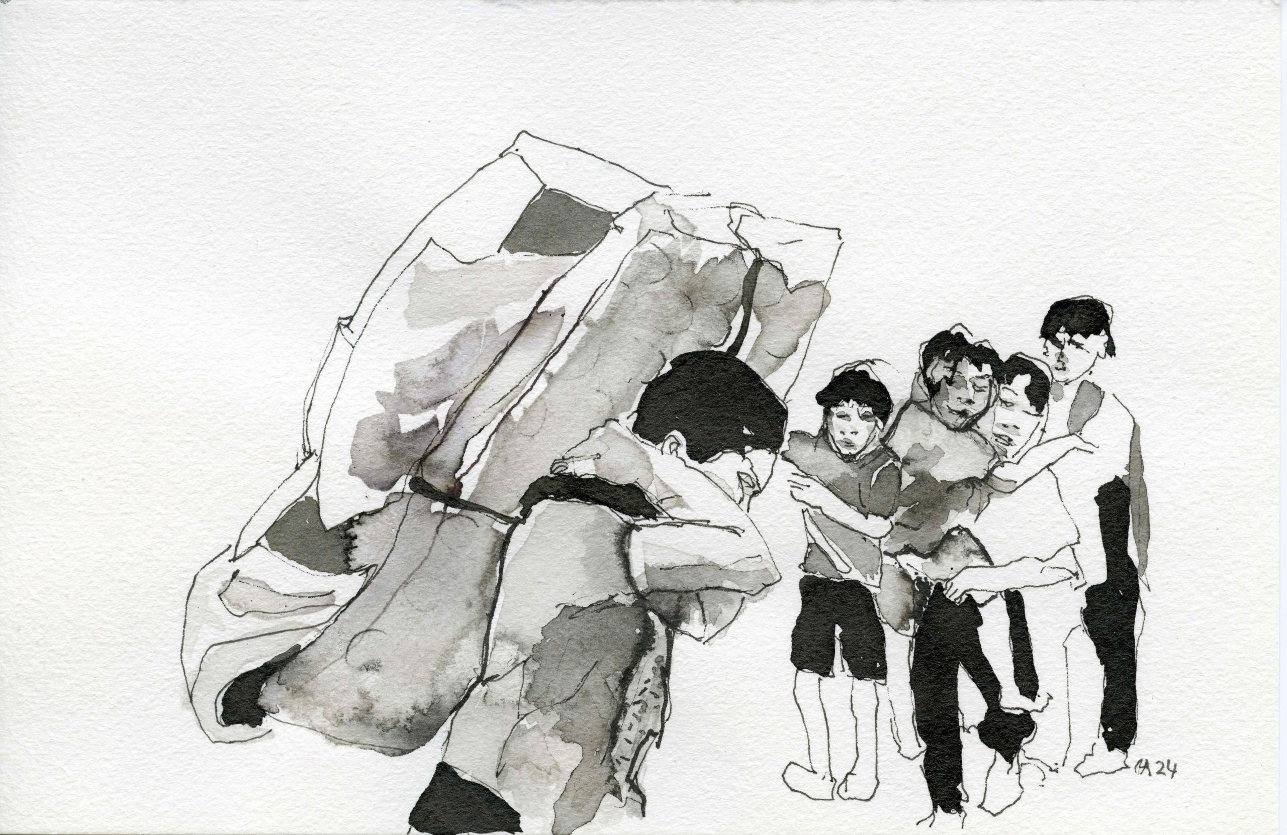 Et ce sujet des migrants, des déplacés, des déportés, des gens jetés sur les routes, des pieds enflés, brûlants, des estomacs vides, de l’espoir auquel on s’accroche pour ne pas sombrer dans le néant du désespoir, de la chute sans fin dans l’incompréhension la plus grande, de ce cri muet, indicible quand tout sens disparaît …des fois la douleur, la colère, la haine qui nous tord et nous perd de tant de violence autour et dedans…tout cela je peux par mes dessins le vivre, le revivre, tout cela devient/est vrai.