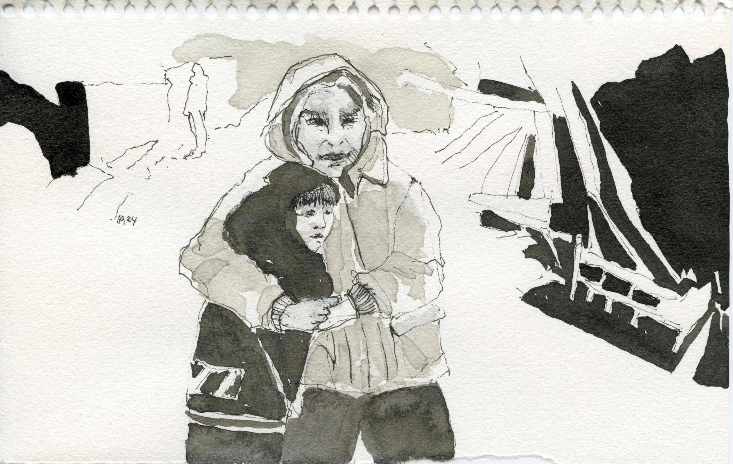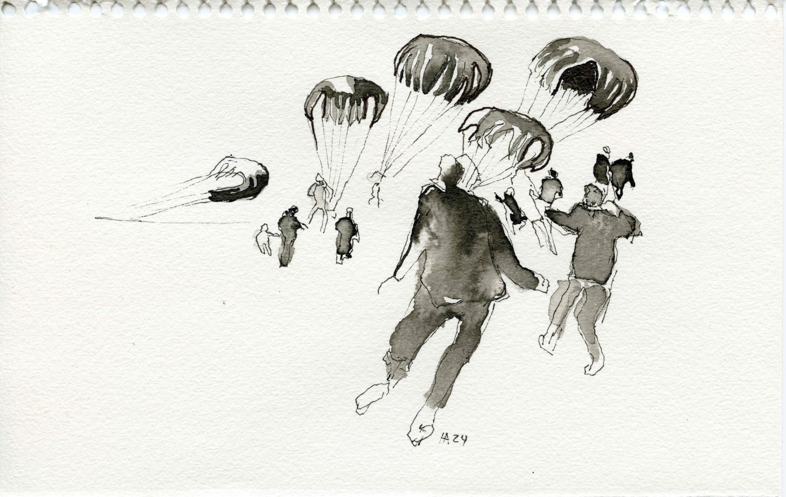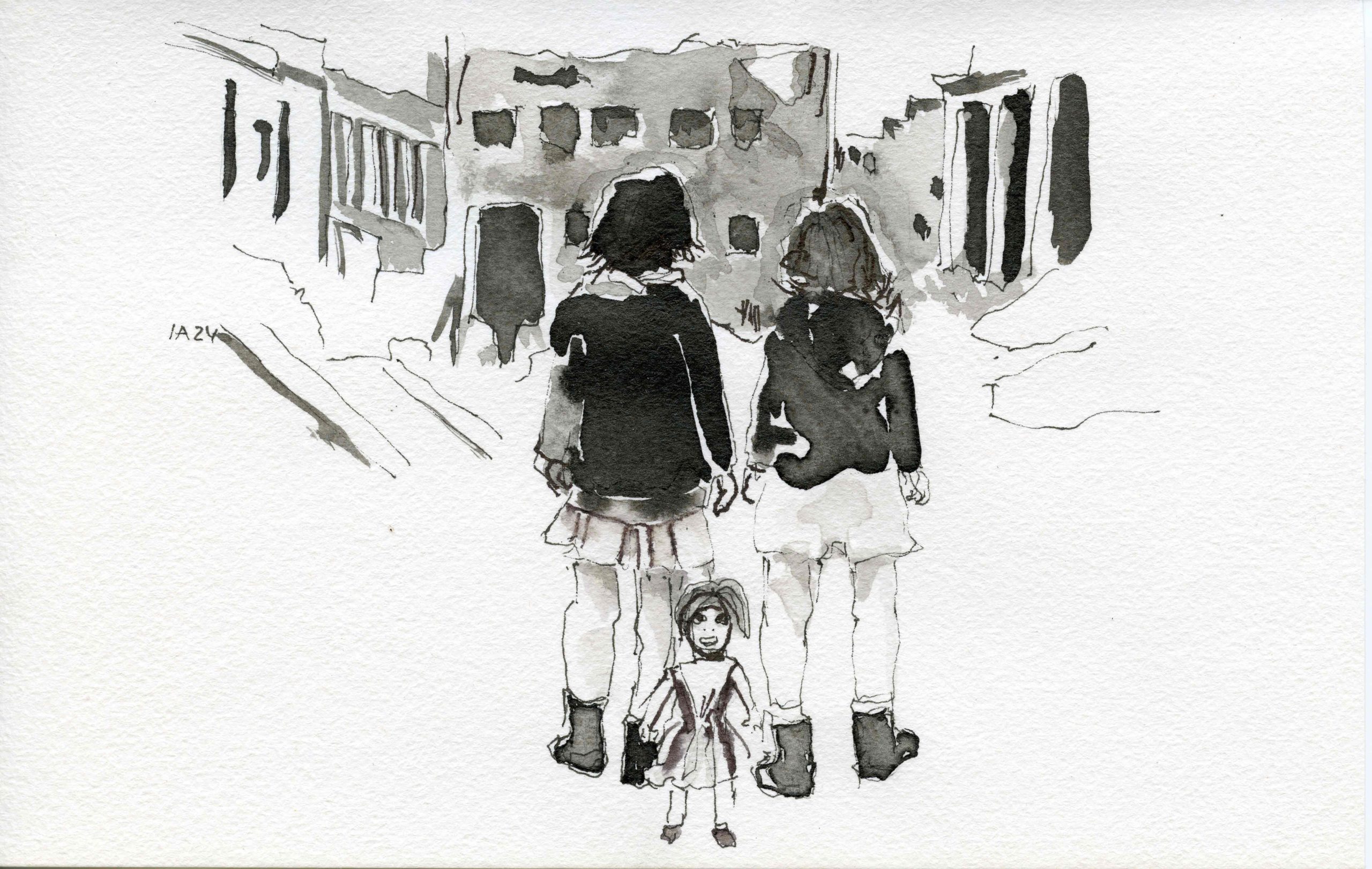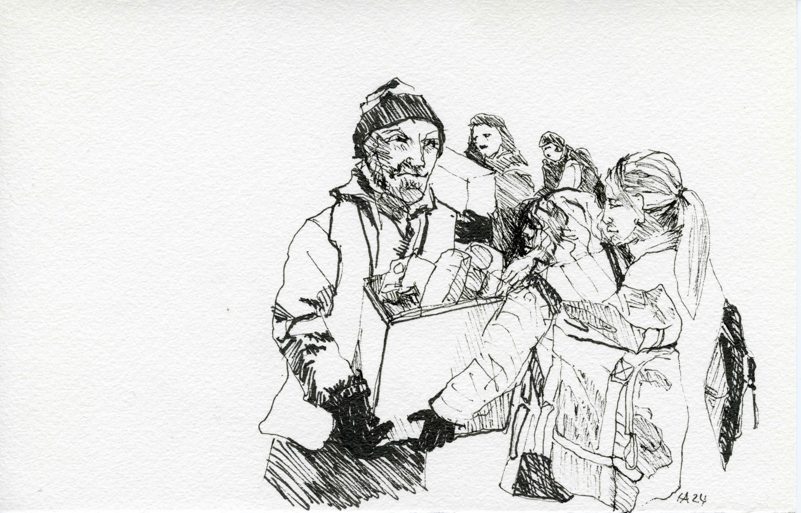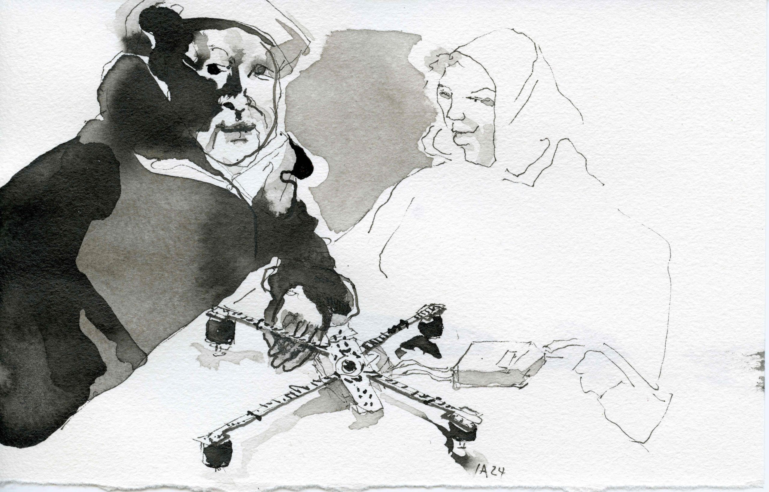 Et ce sujet des migrants, des déplacés, des déportés, des gens jetés sur les routes, des pieds enflés, brûlants, des estomacs vides, de l’espoir auquel on s’accroche pour ne pas sombrer dans le néant du désespoir, de la chute sans fin dans l’incompréhension la plus grande, de ce cri muet, indicible quand tout sens disparaît …des fois la douleur, la colère, la haine qui nous tord et nous perd de tant de violence autour et dedans…tout cela je peux par mes dessins le vivre, le revivre, tout cela devient/est vrai.