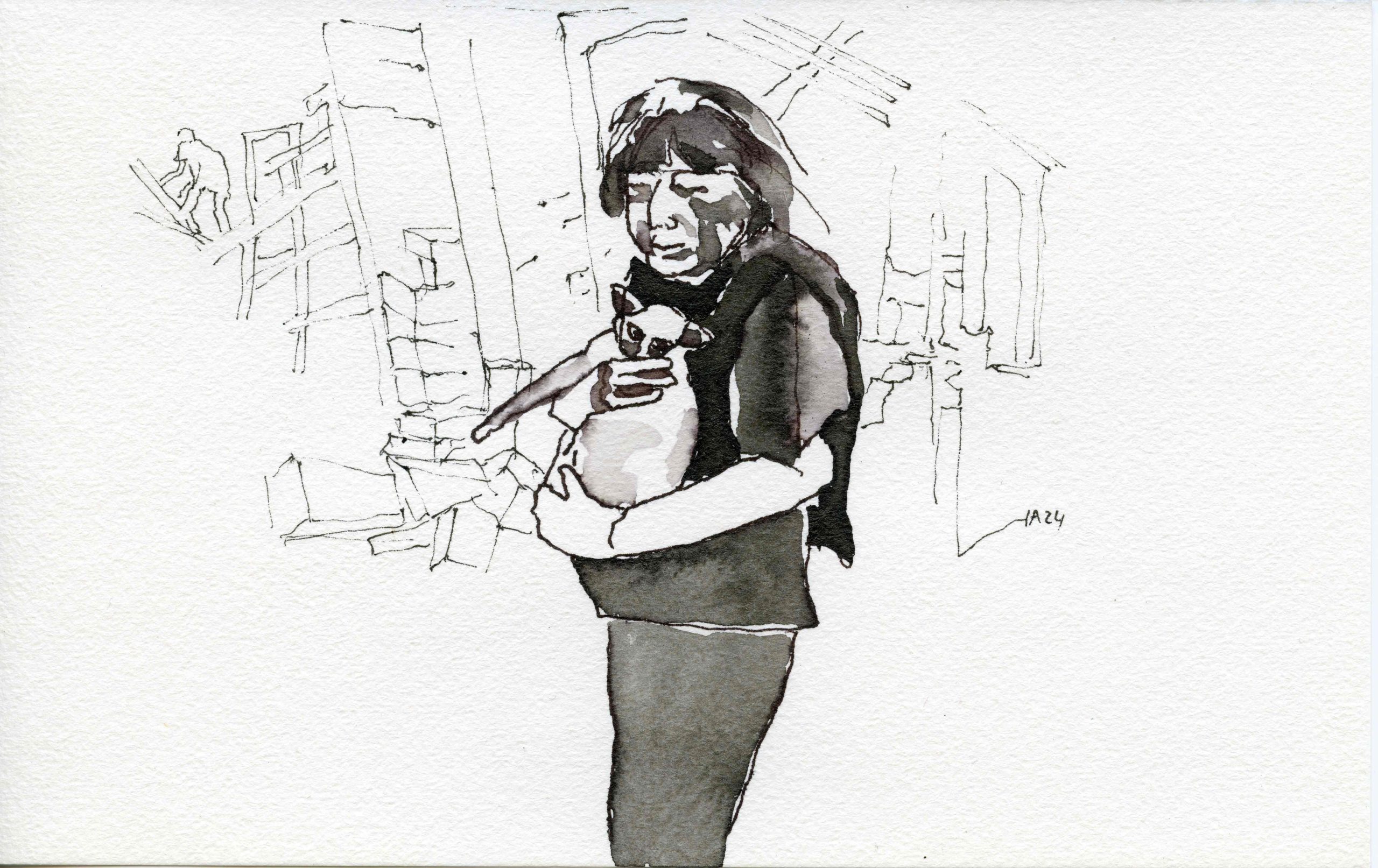 Aquarelle et encre sur carnets, 11×18 cm De 2017 à 2024 (actuellement  au nombre de 85) Dans les expositions je les présente sur une ligne, (la dernère avait 15m) créant ainsi pour le visiteur un déplacement obligé. Elles sont positionnées assez bas de façon à ce que le corps se courbe pour les voir.